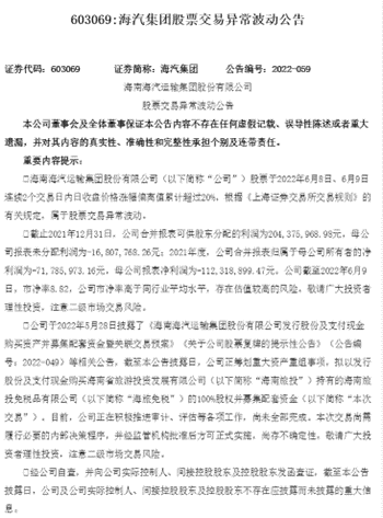 公告還顯示,公司于2022年5月28日披露了《海南海汽運輸集團股份有限公司發行股份及支付現金購買資產并募集配套資金暨關聯交易預案》《關于公司股票復牌的提示性公告》(公告編號:2022-049)等相關公告,截至本公告披露日,公司正籌劃重大資產重組事項,擬以發行股份及支付現金購買海南省旅游投資發展有限公司(以下簡稱“海南旅投”)持有的海南旅投免稅品有限公司(以下簡稱“海旅免稅”)的100%股權并募集配套資金(以下簡稱“本次交易”)。目前,公司正在積極推進審計、評估等各項工作,尚未全部完成。本次交易尚需履行必要的內部決策程序,并經監管機構批準后方可正式實施,尚存不確定性。敬請廣大投資者理性投資,注意二級市場交易風險。