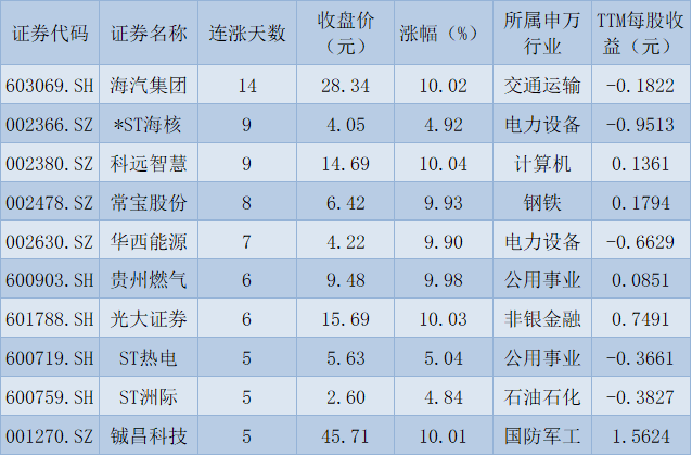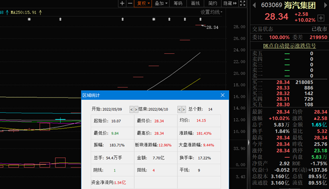 6月10日,海汽集團繼續漲停,這是該股實現14連陽走勢,且最近9個交易日均實現一字漲停板,14日累計漲幅達181.43%。截至今日收盤,海汽集團報28.34元,成交額達1.65億元,換手率1.84%,買一封單達218085手。