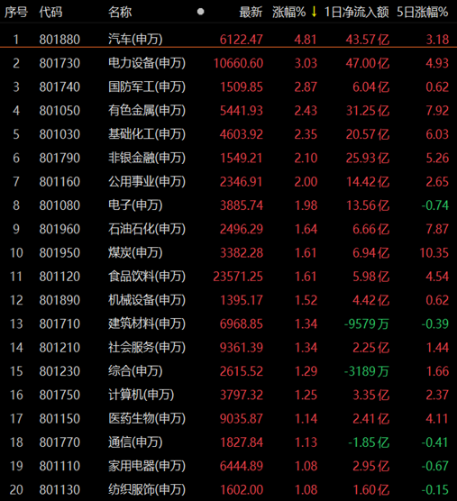 從申萬一級行業看,汽車行業漲幅居前,收報6122.47點,漲幅達4.81%。