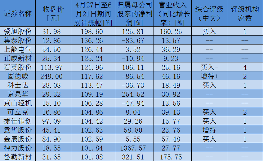 表:4月27日至6月21日,風電和光伏概念板塊個股漲幅超100%個股一覽