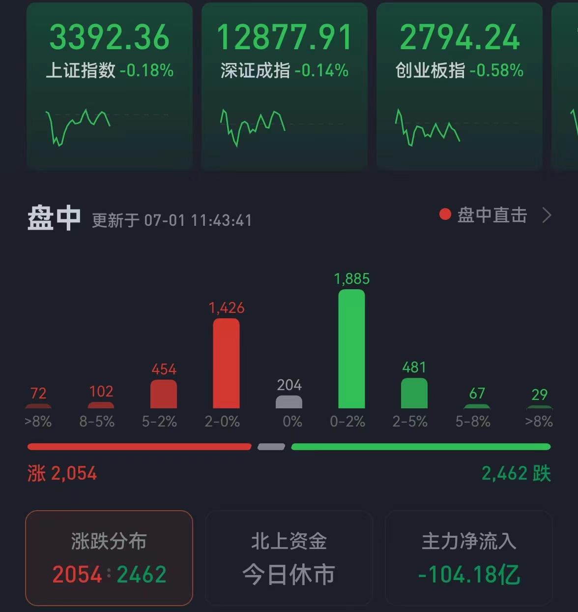 周五(7月1日),三大股指震蕩回落。截至上午收盤,上證指數跌0.18%,報3392.36點,失守3400點整數關口;深證成指和創業板指跌幅分別為0.14%和0.58%;滬深兩市合計成交額6701.8億元;總體來看,兩市個股漲少跌多。