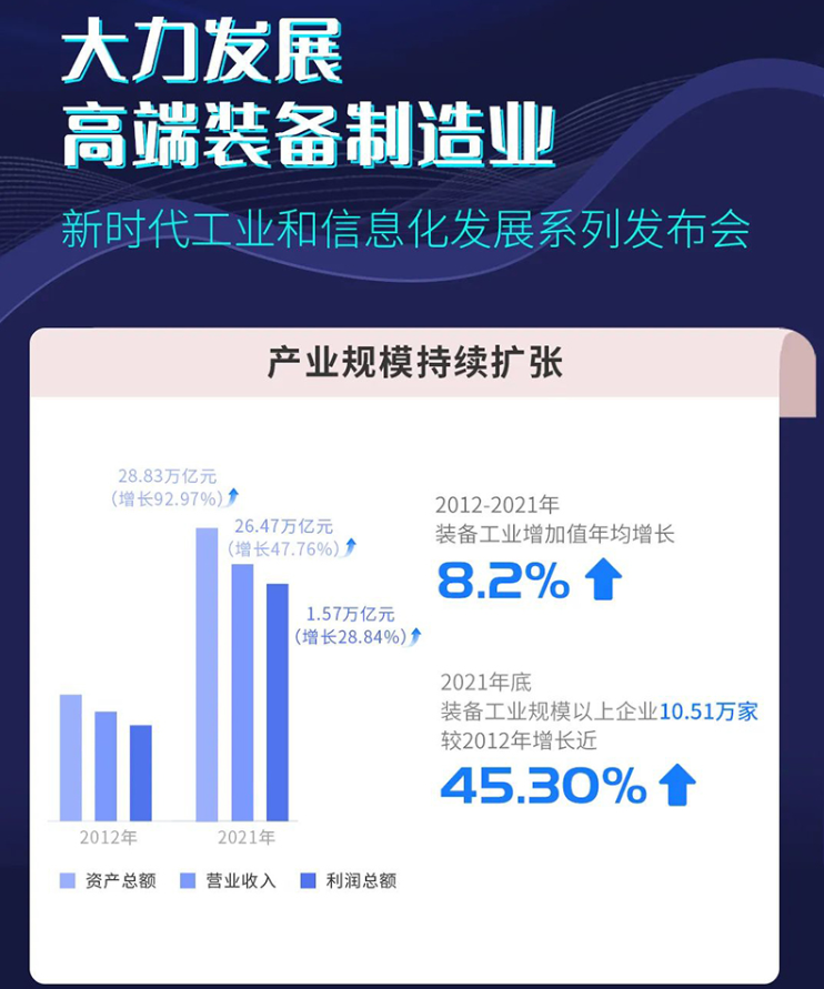 十年來,我國裝備工業(yè)產(chǎn)業(yè)規(guī)模持續(xù)擴張,產(chǎn)業(yè)結(jié)構(gòu)持續(xù)優(yōu)化。數(shù)據(jù)顯示,2012年—2021年,裝備工業(yè)增加值年均增長8.2%,始終保持中高速,至2021年底,裝備工業(yè)規(guī)模以上企業(yè)達10.51萬家,比2012年增長近45.30%;資產(chǎn)總額、營業(yè)收入、利潤總額分別達到28.83萬億元、26.47萬億元和1.57萬億元,比2012年分別增長92.97%、47.76%、28.84%。