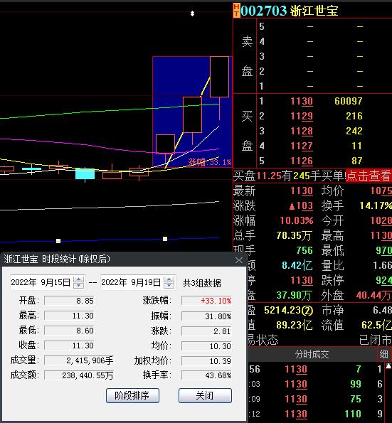 9月19日,熱門股浙江世寶再度漲停,截至收盤,報11.30元,實現3連板,累計漲幅達33.1%。