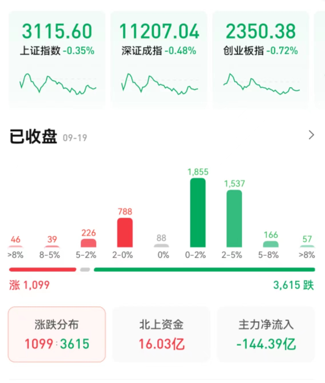 9月19日,A股三大指數震蕩回落,集體收跌。截至收盤,上證指數跌0.35%報3115.6點,深證成指跌0.48%報11207.04點,創業板指跌0.72%報2350.38點,走出了日線五連陰的態勢。兩市合計成交6653億元,成交額創年內新低。總體來看,A股個股跌多漲少,上漲個股為1099只,下跌個股3615只。