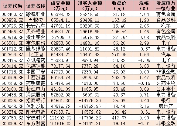 值得關注的是,今日北向資金凈買入金額達16.03億元。其中,滬港通凈買入金額達6.70億元,深股通凈買入金額達9.32億元。從前十大成交活躍股來看,今日,贛鋒鋰業、五糧液、長安汽車等3只個股,北向資金凈買入金額均超2億元。