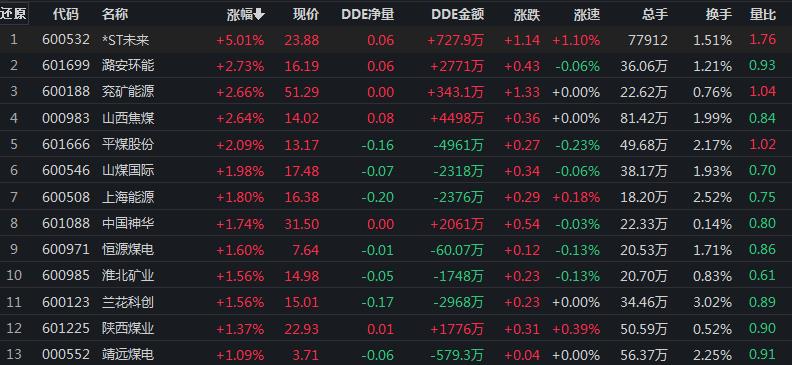 9月19日,煤炭行業漲幅居首達1.11%.其中,*ST未來漲停。