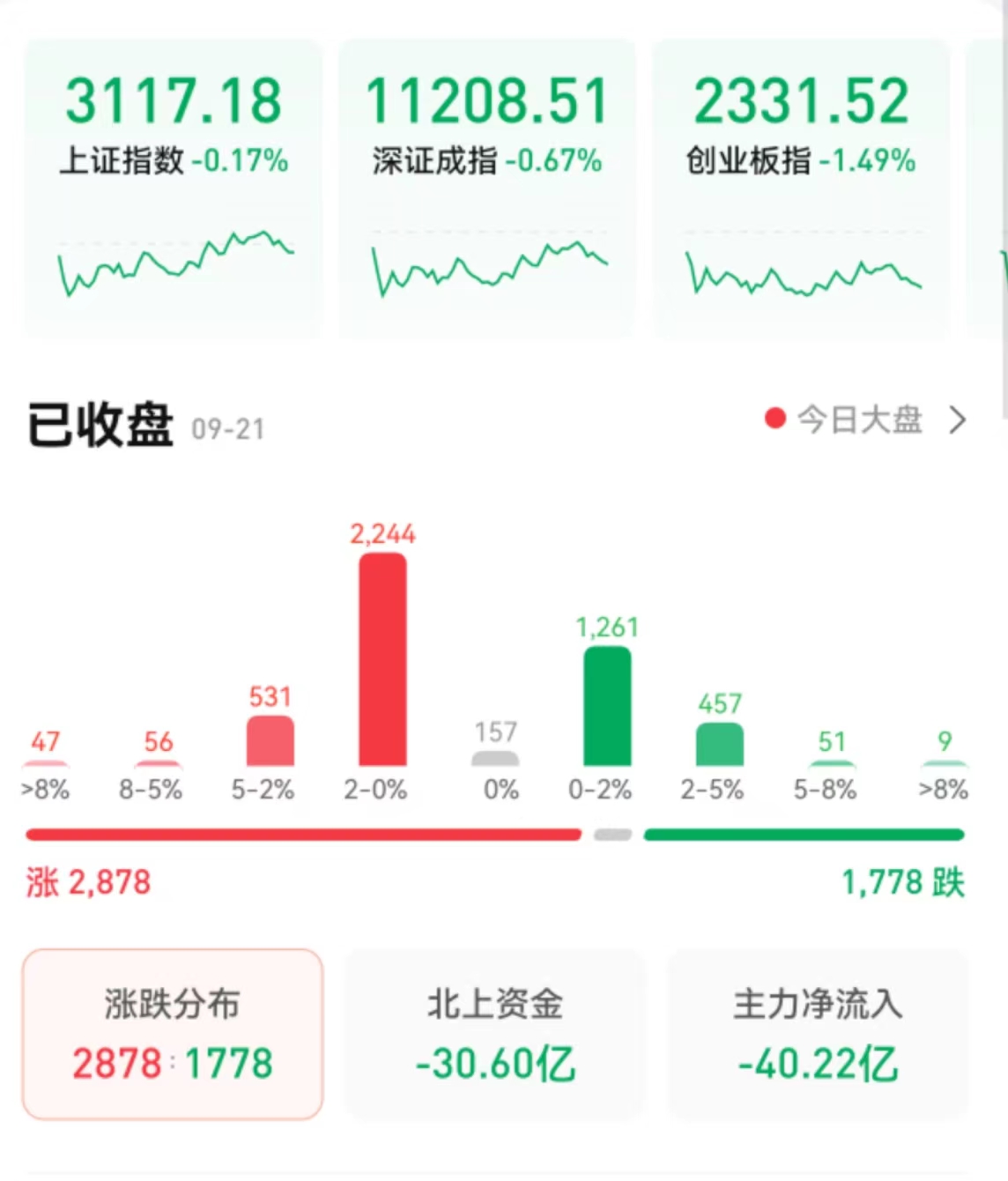 9月21日,A股三大指數(shù)震蕩回落,集體收跌。截至收盤,上證指數(shù)微跌0.17%報3117.18點,深證成指跌0.67%報11208.51點,創(chuàng)業(yè)板指跌1.49%報2331.52點,兩市合計成交6359億元,北向資金凈賣出30.6億元??傮w來看,A股個股漲多跌少。