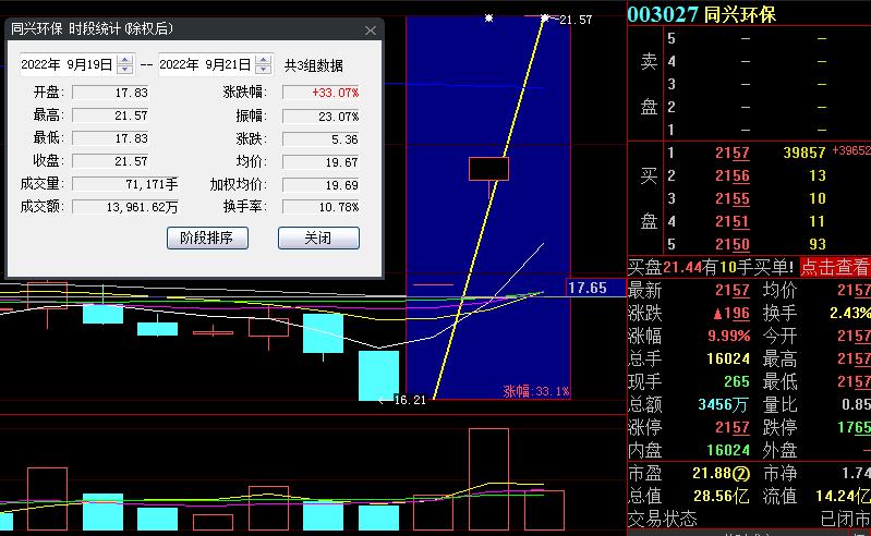 9月21日,熱門股同興環(huán)保再度漲停,截至收盤,報收21.57元,實現(xiàn)3連板,累計漲幅達33.07%。