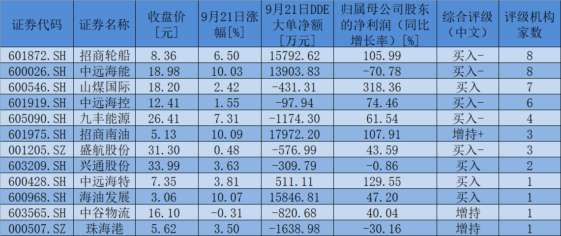 最近30日內,航運板塊還有12只個股獲機構給予“買入”或“增持”等看好評級。其中,包括招商輪船、中遠海能、山煤國際、中遠海控等4只個股均獲得5次以上機構集中推薦。