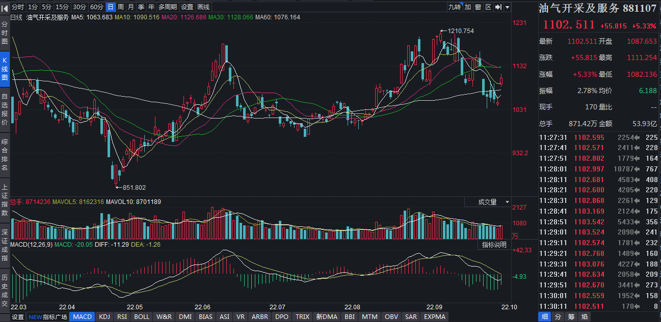 受國際油價顯著反彈等因素的影響,10月10日,A股同花順油氣開采及服務(wù)板塊表現(xiàn)強勢,截至11:30,油氣開采及服務(wù)板塊指數(shù)漲5.33%,位居同花順行業(yè)漲幅榜前列,大幅跑贏上證指數(shù)(跌幅0.39%)。板塊內(nèi)21只個股全部實現(xiàn)上漲,其中,貝肯能源漲停。