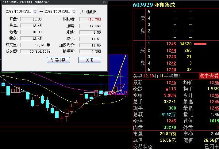 10月28日,熱門股亞翔集成漲停,截至收盤,報12.45元,連續4個交易日實現上漲,累計漲幅達13.7%。