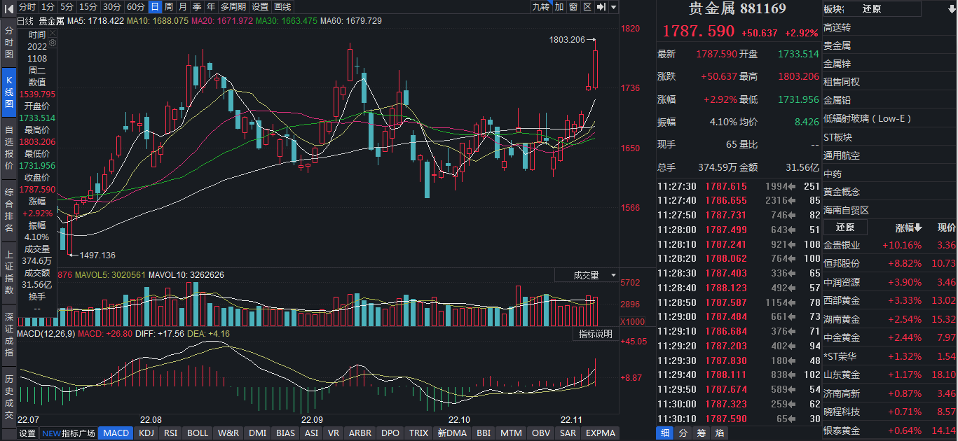 在貴金屬價格上行帶動下,A股貴金屬板塊也比較強勢。11月8日,截至11:30,同花順貴金屬行業板塊上漲2.92%,位居同花順行業漲幅榜榜首。個股方面,金貴銀業漲停。