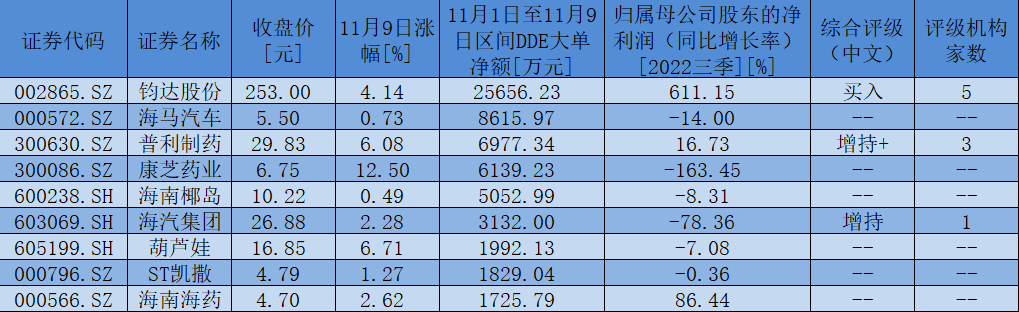 表:11月1日至11月9日,獲大單資金凈流入額超1000萬(wàn)元的海南自貿(mào)區(qū)板塊個(gè)股一覽