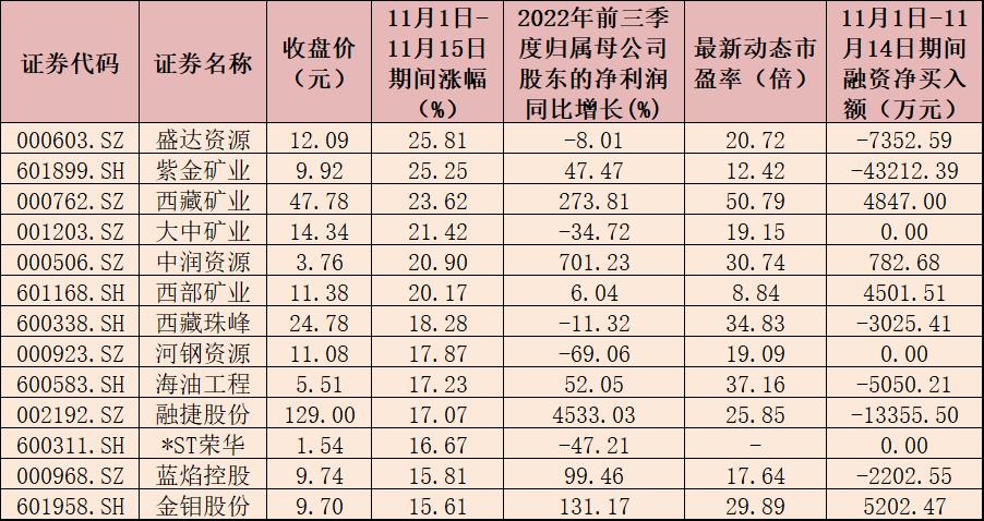 表:11月1日至11月15日期間漲幅超15%的采礦板塊內個股一覽