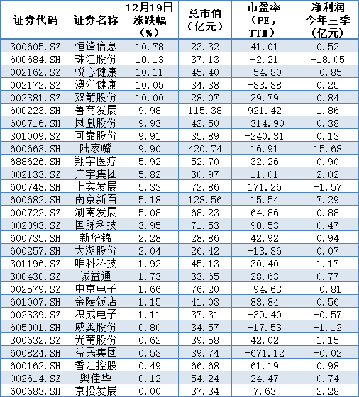 養老服務作為擴大內需的重要消費場景之一被提及,再度引發市場關注。12月19日盤中,養老概念部分個股走強,截至收盤,98只概念股中48只跑贏大盤,珠江股份、悅心健康、澳洋健康、雙箭股份、魯商發展漲停,鳳凰股份、可靠股份和陸家嘴等個股漲幅均超9%。
