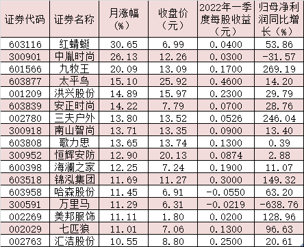 5月份以來,截至5月15日,紡織服裝板塊集體崛起,其整體漲4.56%,跑贏上證指數(月內累計跌0.38%)。其中,17只個股月內累計漲幅超10%,紅蜻蜓、中胤時尚、九牧王等3只個股期間累計漲幅居前,均超20%。