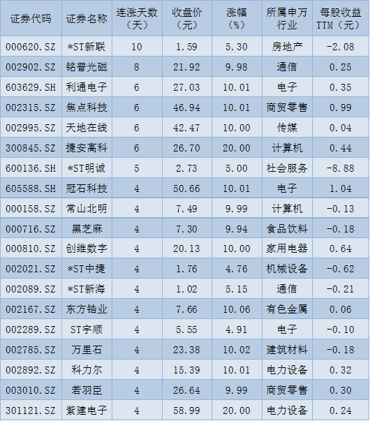 表:連續(xù)上漲4日且今日收盤漲停股一覽