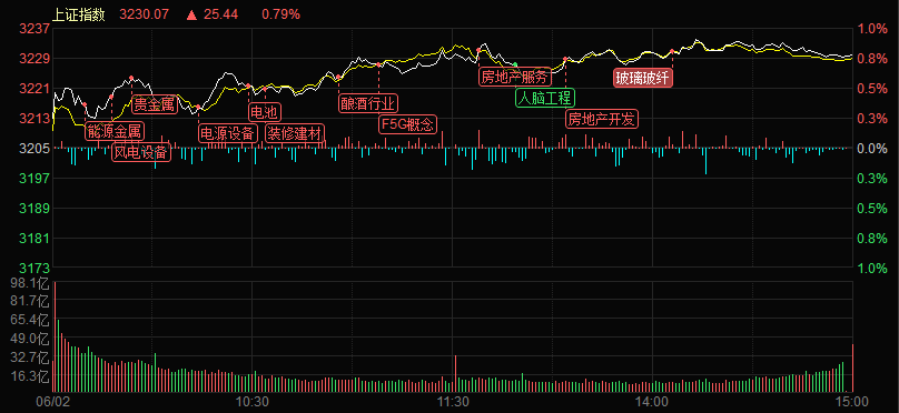 6月2日,A股三大股指高開高走,權(quán)重藍(lán)籌表現(xiàn)強勢,上證50指數(shù)大漲超1.7%,滬指成功收復(fù)年線,兩市呈深強滬弱格局。截至收盤,上證指數(shù)漲0.79%報3230.07點;深證成指漲1.50%報10998.07點,創(chuàng)業(yè)板指漲1.22%報2233.27點,A股合計成交額9421.04億元,較前一交易日縮減4.67%;北向資金全天凈買入85.34億元;其中滬股通凈買入31.30億元,深股通凈買入54.04億元。今日A股漲多跌少,有3400只上漲,1599只下跌。