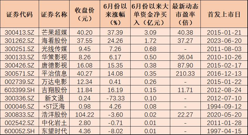 表:6月份以來大單資金凈買入的影視概念股一覽