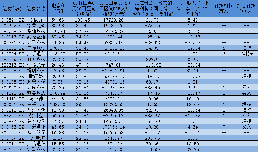 表:6月1日至6月20日,通信設備板塊期間累計漲幅超20%個股一覽