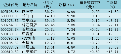 表:酒店及餐飲、景點及旅游板塊漲幅前十個股一覽
