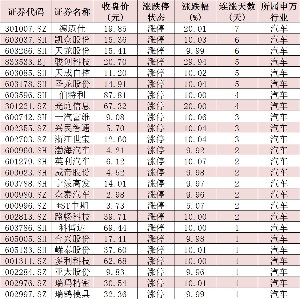 具體來看,今日,汽車產業(yè)鏈徹底爆發(fā),掀起了罕見的漲停潮,其中,胎壓監(jiān)測板塊領漲,路暢科技等5只個股漲停;新能源汽車概念股持續(xù)強勢,包括德邁仕、英利汽車等多只概念股漲停;無人駕駛板塊持續(xù)走強,得潤電子等16只概念股漲停;汽車零部件股集體走強,圣龍股份等23只個股漲停;創(chuàng)新藥概念股午后異動,海思科、通化金馬漲停;EDR概念、華為汽車、減速器、汽車芯片、車聯網、傳感器、英偉達概念、第三代半導體等板塊表現活躍。中船系板塊領跌,芬太尼、醫(yī)藥商業(yè)、毛發(fā)醫(yī)療、醫(yī)藥電商、房地產服務、電力、教育、銀行等板塊跌幅居前。