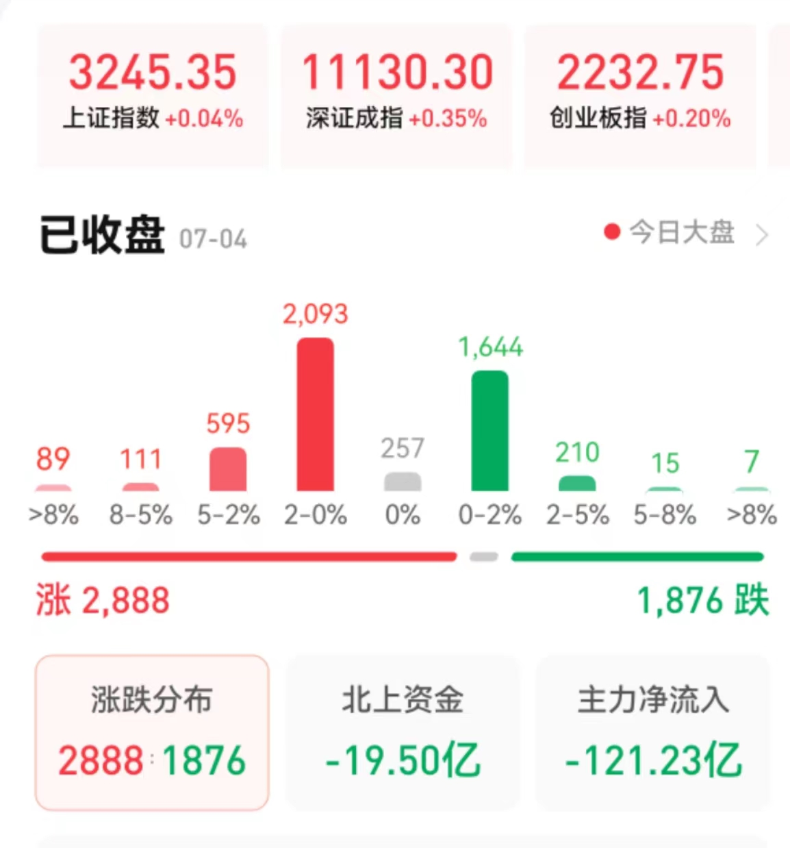 周二(7月4日),A股三大股指震蕩上行,全線飄紅。截至收盤,上證指數微漲0.04%報3245.35點,深證成指漲0.35%報11130.3點,創(chuàng)業(yè)板指漲0.2%報2232.75點,兩市合計成交金額達9293億元,北向資金凈賣出19.5億元。總體上看,兩市個股漲多跌少。其中,漲停個股達60只,跌停個股5只。