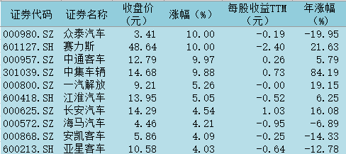 表:今日汽車整車板塊漲幅前十個股一覽