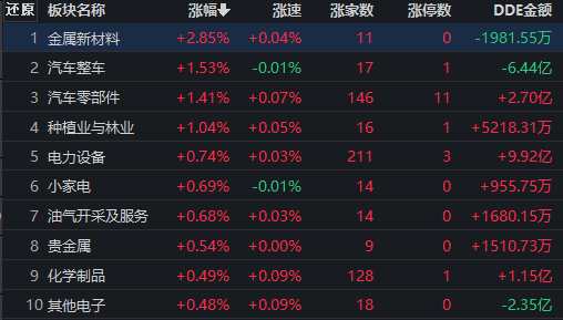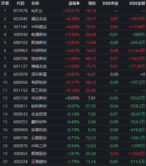 從早盤表現(xiàn)強勢的金屬新材料行業(yè)看,交易中的26只成份股中,有11只上漲,其中,有2只個股漲幅超5%。資金方面,有1981.55萬元大單資金凈流出該行業(yè)。