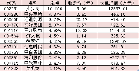 7月18日,零售板塊集體異動(dòng),截至收盤,板塊整體上漲1.59%,跑贏上證指數(shù)(跌0.37%)。其中,中央商場(chǎng)已連收3個(gè)漲停板,步步高也以漲停報(bào)收,匯通能源、友好集團(tuán)分別大漲9.74%、5.07%。
