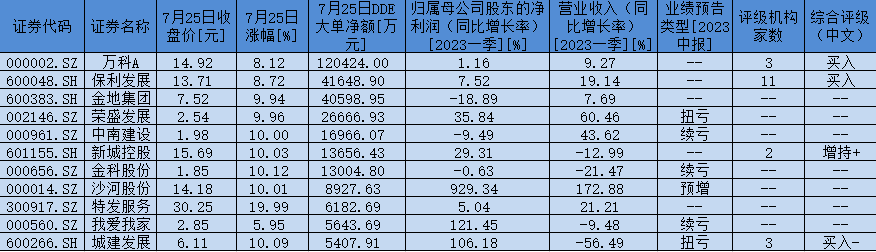 表:7月25日,房地產行業獲大單資金凈流入額超5000萬元個股一覽