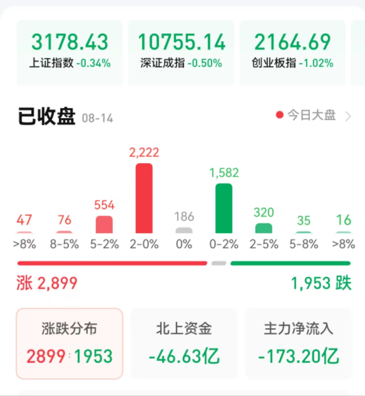 周一(8月14日),A股三大股指震蕩下行,全線飄綠。截至收盤,上證指數跌0.34%報3178.43點,深證成指跌0.50%報10755.14點,創業板指跌1.02%報2164.69點;兩市合計成交金額達7419.61億元。總體上看,兩市個股漲多跌少。其中,漲停個股達36只,跌停個股達7只。