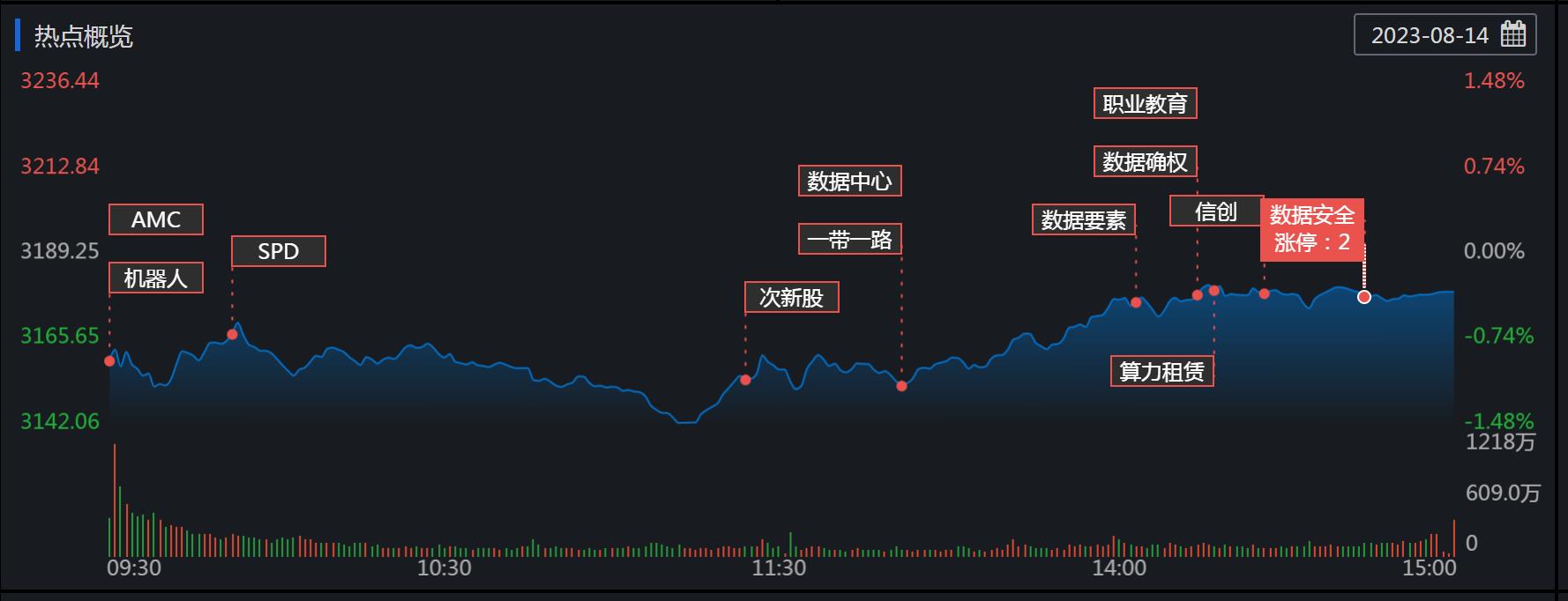 具體熱點方面,今日,數字經濟賽道集體走強,其中,數據確權板塊領漲,中原傳媒等4只概念股漲停;數據安全概念股集體拉升,南凌科技等5只概念股漲停;數據要素板塊持續活躍,久遠銀海等3只概念股漲停;算力概念股集體異動,英飛拓等5只概念股漲停;數據中心概念股盤中拉升,人民網等8只概念股漲停;酒店及餐飲股震蕩反彈,華天酒店漲停;中字頭個股午后走強,中遠海科、中鋼國際漲超5%;算力租賃、國資云、通信服務、知識產權保護、網絡安全、云計算、ChatGPT概念、信創等板塊表現活躍。房地產服務板塊領跌,汽車整車、房地產開發、CRO概念、銀行、小金屬、保險及其他、證券、乳業等板塊跌幅居前。