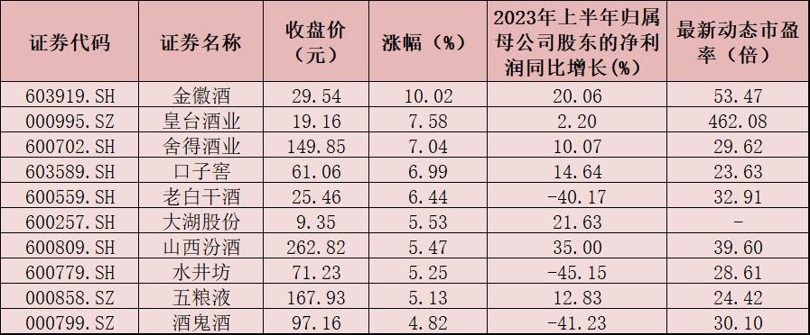 業(yè)績來看,在白酒概念板塊內(nèi)49家發(fā)布2023年半年報的公司中有28家公司今年上半年歸母凈利潤實現(xiàn)同比增長,占比近六成。