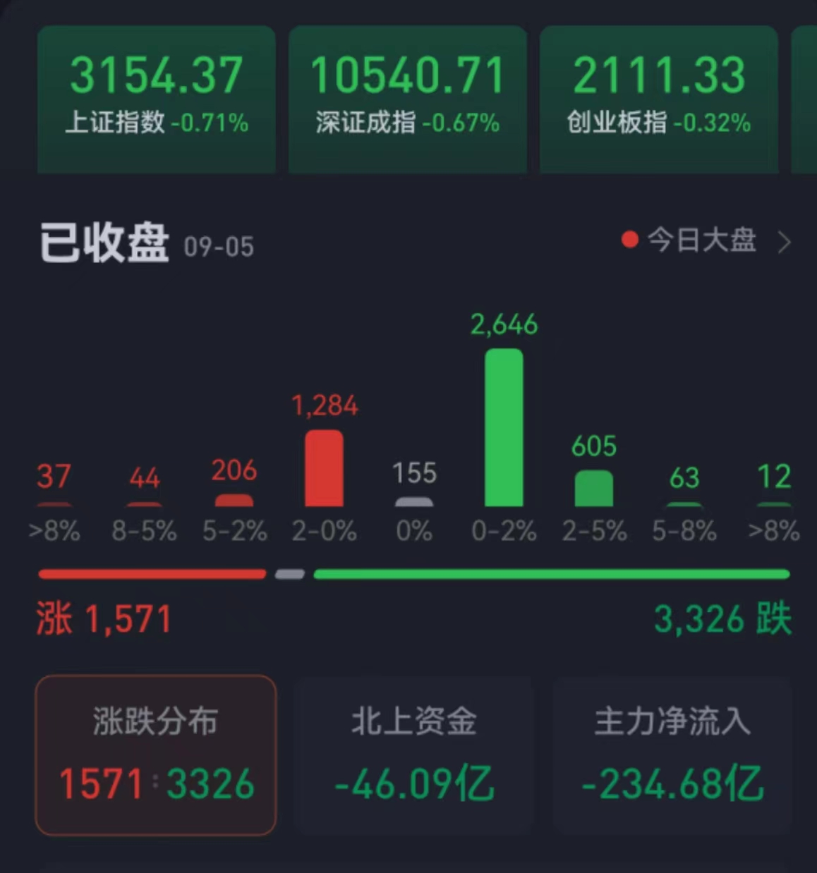 周二(9月5日),A股三大股指震蕩回落。截至收盤,上證指數(shù)跌0.71%報(bào)3154.37點(diǎn),深證成指跌0.67%報(bào)10540.71點(diǎn),創(chuàng)業(yè)板指跌0.32%報(bào)2111.33點(diǎn);兩市合計(jì)成交金額達(dá)8038.57億元,北向資金凈賣出46.09億元。總體上看,兩市個(gè)股跌多漲少。其中,漲停個(gè)股達(dá)23只,跌停個(gè)股達(dá)5只。