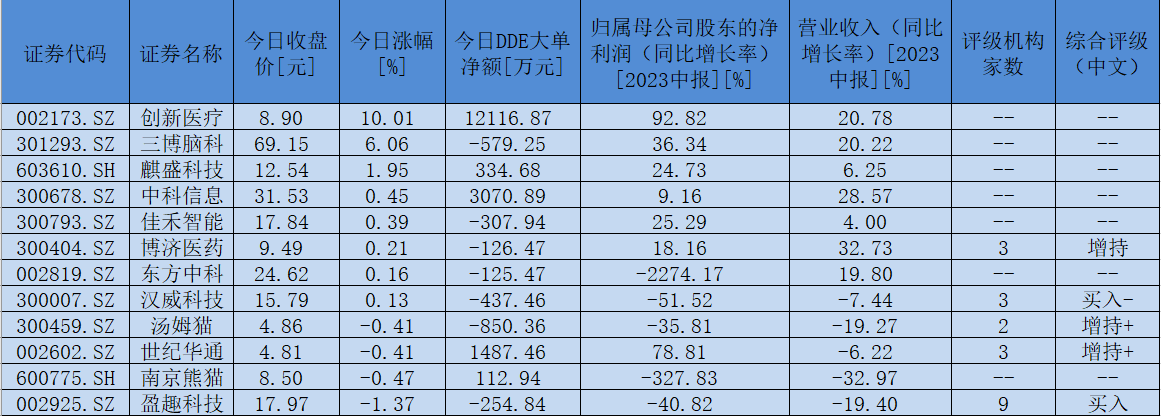 表:9月20日,同花順腦機接口概念板塊個股行情一覽