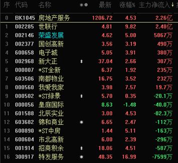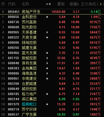 截至午間收盤(pán),房地產(chǎn)領(lǐng)域領(lǐng)漲,細(xì)分行業(yè)房地產(chǎn)服務(wù)以4.53%的漲幅居?xùn)|方財(cái)富行業(yè)漲幅榜首、房地產(chǎn)開(kāi)發(fā)則以3.17%位居第三。