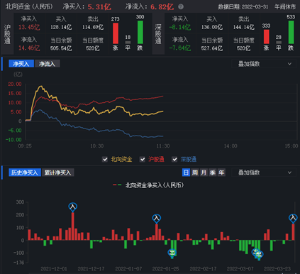 從資金面來(lái)看,3月31日上午,北向資金凈買(mǎi)入金額達(dá)5.31億元。兩融資金方面,截至3月30日,滬深兩市兩融余額為16796.52億元,較前一交易日增加3.76億元。其中,融資余額為15864.28億元;融券余額為932.24億元。