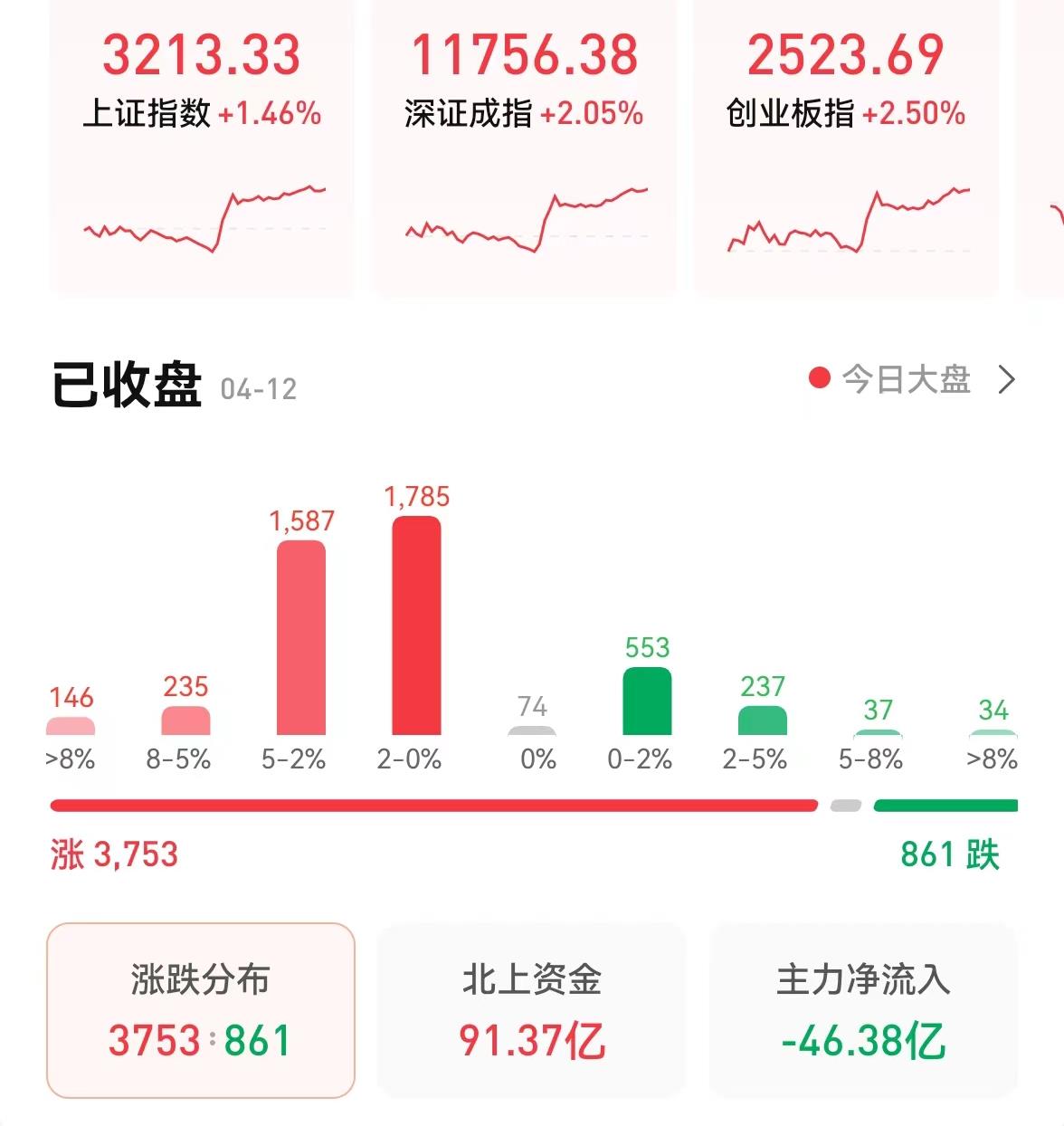 反抽普漲!周二(4月12日),A股三大指數全線飄紅,滬指重返3200點,創業板指也成功站上2500點。熱點方面,住宿餐飲、旅游酒店、白酒和券商等板塊紛紛走強,逾百股漲停。與此同時,北上資金大幅涌入超90億元,A股的反彈行情能否就此開啟呢?