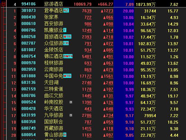 周二,住宿餐飲板塊和旅游酒店板塊聯袂爆發,截至收盤漲幅分別達9.83%和7.09%。具體來看,有16只旅游股直沖漲停,君亭酒店20CM漲停。