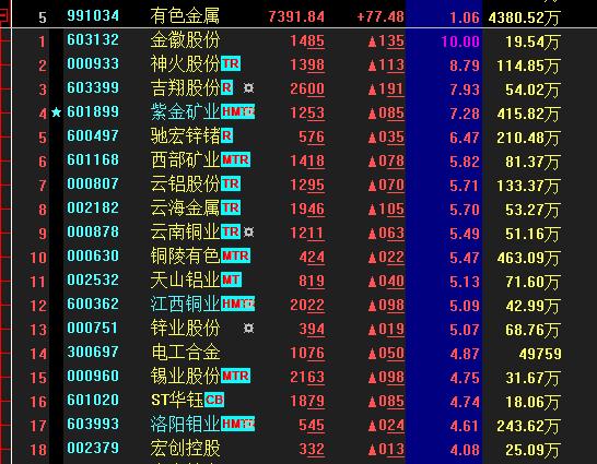 熱點三:有色金屬漲逾1%金徽股份漲停