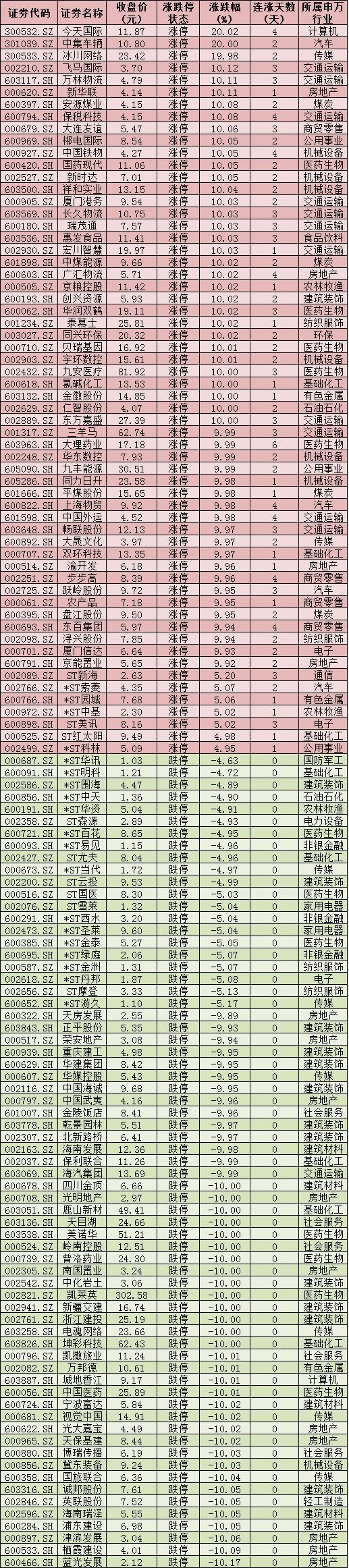 周三(4月13日)漲跌停個股情況: