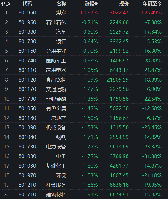 申萬行業(yè)走勢方面,截至5月24日11:30,僅有煤炭1類行業(yè)上漲,占行業(yè)板塊總數(shù)的3.23%,漲幅為0.97%。此外,綜合下跌3.13%,另外包括醫(yī)藥生物與計算機等在內(nèi)的10類行業(yè)跌幅超2%。