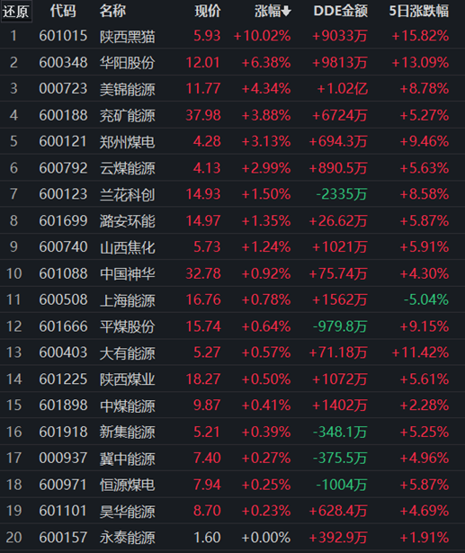 從領(lǐng)漲的煤炭行業(yè)看,截至5月24日11:30,行業(yè)中有6只個股漲幅超2%,其中,陜西黑貓封漲停板。