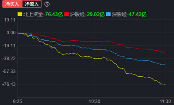 資金方面,北向資金早盤凈買入-76.43億元,其中,滬股通凈買入-29.02億元;深股通凈買入-47.42億元。