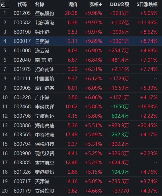 從領漲的交通運輸行業看,截至5月25日11:30,行業中有19只個股漲幅超5%,其中,4只封漲停板。
