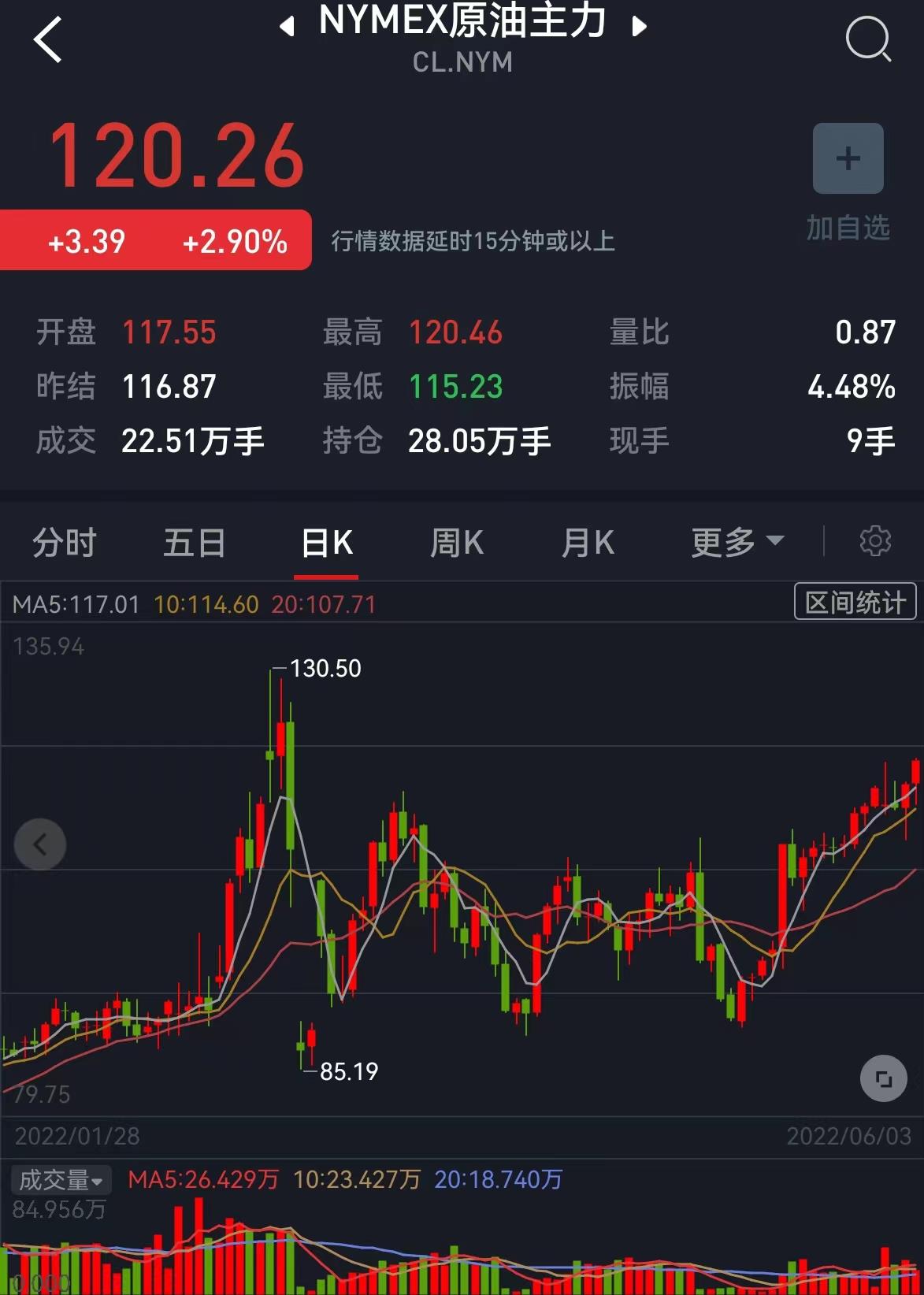 周五,國際油價全線上漲,美油7月合約漲2.9%,報120.26美元/桶。布油8月合約漲2.95%,報121.08美元/桶,紛紛創(chuàng)近三個月以來新高。本周,美油7月合約漲4.51%,布油8月合約漲4.78%。