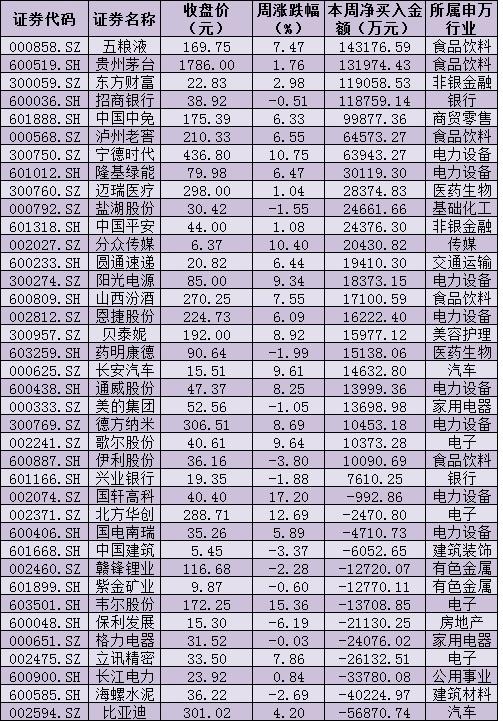 資金方面,北向資金本周四個交易日全部為凈買入,累計凈買入金額達253.44億元。從前十大成交活躍股來看,本周,五糧液、貴州茅臺、東方財富、招商銀行等4只個股,北向資金期間凈買入金額均超10億元。另外,比亞迪、海螺水泥等個股遭北向資金凈賣出金額均超4億元。