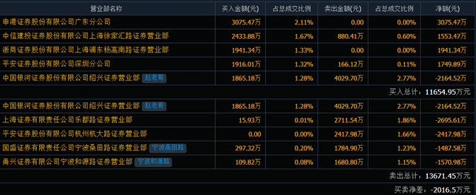 6月24日龍虎榜數據顯示,上榜的前五大買賣營業部合計成交2.53億元,其中,買入成交額為1.17億元,賣出成交額為1.37億元,合計凈賣出2016.49萬元。