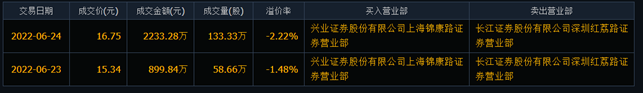 大宗交易方面,成交均價16.75元,溢價率-2.22%,成交量133.3萬股,成交金額2233萬元。